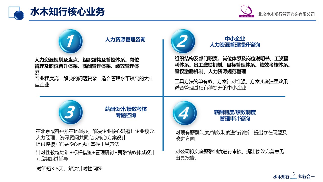 北京水木知行管理咨詢有限公司(www.bjsmzx_com.yunhangtech.com)專注提供人力資源管理咨詢、人力資源管理培訓、人力資源招聘咨詢、人力資源獵頭服務業務;咨詢業務范圍包括組織結構與管控體系、崗位管理體系、薪酬管理體系、績效管理體系,咨詢形式包括全過程咨詢、教練式咨詢和特訓班;培訓業務包括企業基礎管理...[詳情]